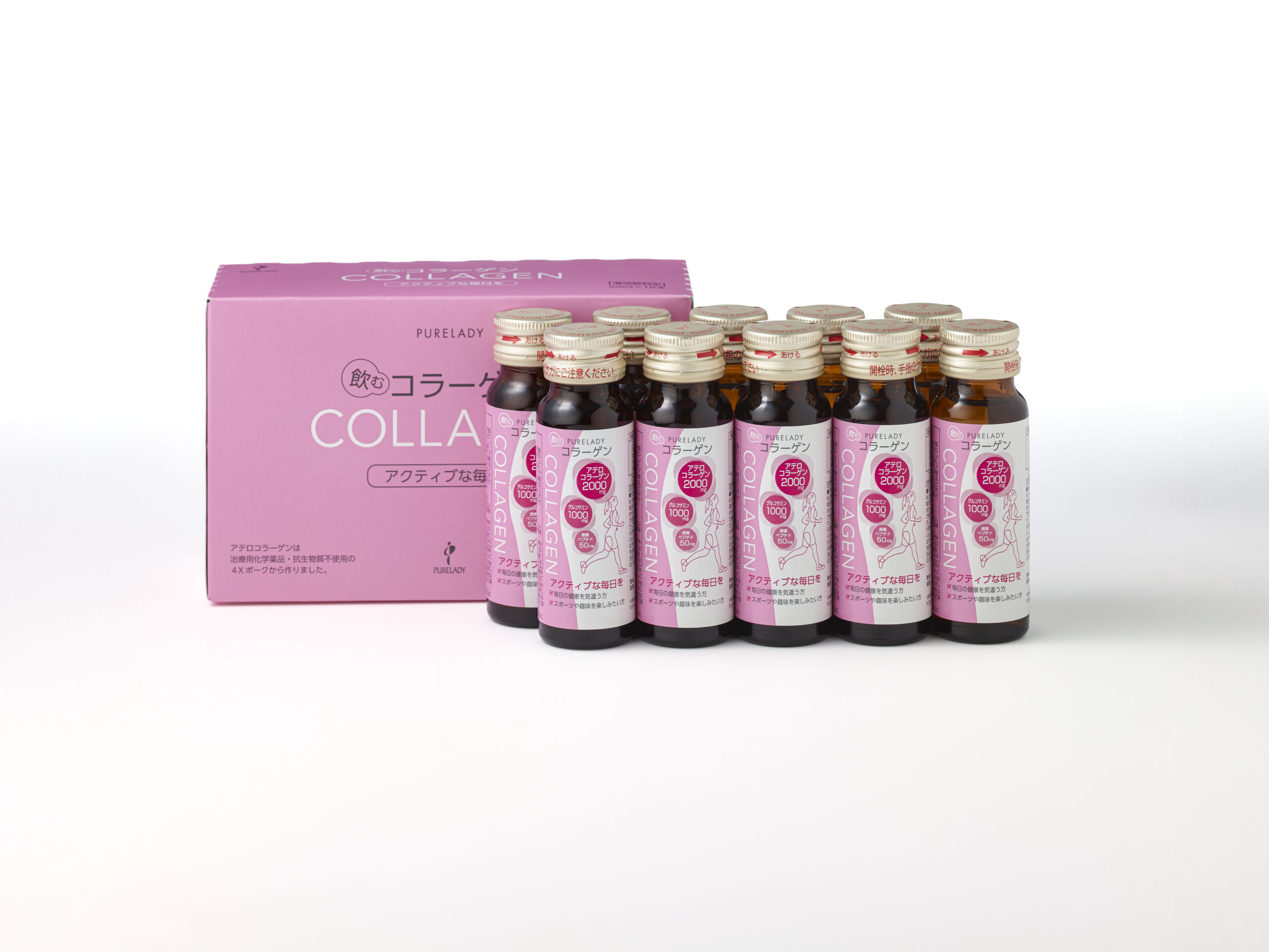 治療用化学薬品・抗生物質不使用で育てた4Xポーク(SPF豚)から作ったアテロコラーゲンを2,000㎎配合。希少価値、安全性の高いアテロコラーゲン2,000㎎に加え、関節のサポートに「グルコサミン1,000㎎」骨のサポートに「卵黄ペプチド50㎎」配合。いつまでもスポーツや趣味を楽しみたい方へおすすめの健康飲料です。